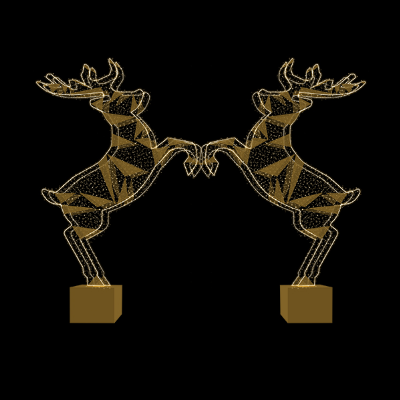 Casal de Renas Luxo (5,60m de largura x 0,50m de profundidade x 4,00m de altura), luminoso em forma de Rena com abertura para entrada de pedestre, produzido em estrutura metálica, em tubos de metalon 50x30, 30x30, 20x20 e 15x15 Par 15, ferro chato 1/2 x 1/8, reforço em ferro redondo liso 1/4, 3/16 e barra chata 1 x 1/8. Detalhes diagonais em chapa 28. Todo contorno recebe arame 4,2mm para fixação dos cordões de led, pintura automotiva na cor OURO Contorno com mangueira neon led de 7,5 x 15mm de diâmentro, com efeito fixo, o corte a cada metro, com 60 LEDs por metro, Leds deitado com visão 360º, com acendimento dos 2 lados, 220v, totalmente a prova dágua, na cor BRANCO QUENTE (obedecendo a temperatura de cor entre 3500K). Revestimento interno com cordões de 100 LED blindado 220v, para suo externo, com efeito estrobo, sendo que a cada 04 (quatro) lâmpadas QUENTE/WARM a quinta lâmpada deve ser na cor BRANCO FRIO (obedecendo a temperatura de cor entre 6000 e 6500k) que pisca, com espaçamento de 0,10m entre as lâmpadas, com comprimento mínimo de 10 metros com 4 fios de 1,8 MM, no mínimo 100 leds por cordão. Lâmpadas de 5 MM ou mais, blindadas com cola de silicone na sua base, com revestimento em plástico duro transparente e recobertas por capa plástica na cor CRISTAL. Tomada macho e fêmea de rosca e retificador blindado 12w de 7.00 x 2,5 centímetro.