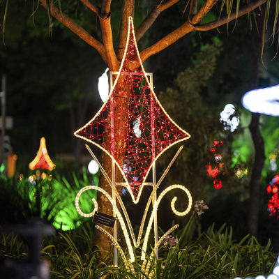 Arabesco (1,10 de largura x 0,03 de profundidade x 2,50 de altura), luminoso em forma de estrela 4 pontas , produzido em estrutura metálica, em tubos de metalon 20x20 e 15x15 Par 15, ferro chato 1/2 x 1/8, reforço em ferro redondo liso 3/16, além de cantoneira 1x1/8. Todo contorno recebe arame 4,2mm para fixação dos cordões de led, pintura automotiva na cor BRANCA. Contorno com mangueira luminosa led de 10 MM de diâmentro, com efeito fixo, o corte a cada metro, com 36 LEDs por metro, Leds deitado com visão 360º, potência 3w por metro, 220v, totalmente a prova dágua, na cor BRANCO FRIO (obedecendo a temperatura de cor entre 6000 e 6500K). Revestimento interno com cordões de 100 LED blindado 220v, para suo externo, com efeito estrobo, sendo que a cada 04 (quatro) lâmpadas VERMELHO a quinta lâmpada deve ser na cor BRANCO FRIO (obedecendo a temperatura de cor entre 6000 e 6500k) que pisca, com espaçamento de 0,10m entre as lâmpadas, com comprimento mínimo de 10 metros com 4 fios de 1,8 MM, no mínimo 100 leds por cordão. Lâmpadas de 5 MM ou mais, blindadas com cola de silicone na sua base, com revestimento em plástico duro transparente e recobertas por capa plástica na cor VERMELHO. Tomada macho e fêmea de rosca e retificador blindado 12w de 7.00 x 2,5 centímetro. Tubo Snow Fall Led "CHIPS ON BOARD", bivolt automático, em tubo plástico, grau de proteção IP 65, com resistência a impactos e ações intempéries, revestido em processo de injeção plástica, e seus devidos componentes de ligação. Tubo de LED 80cm na cor branco frio, 6000k, com efeito Meteoro. Visualização 360º.