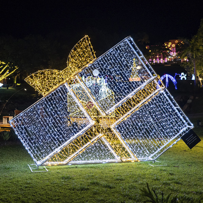 Caixa de Presente (3,05 de largura x 0,20 de profundidade x 2,10 de altura), luminoso em forma de Caixa de Presente , produzido em estrutura metálica, em tubos de metalon 20x20 e 15x15 Par 15, ferro chato 1/2 x 1/8, reforço em ferro redondo liso 3/16, além de cantoneira 1x1/8. Todo contorno recebe arame 4,2mm para fixação dos cordões de led, pintura automotiva na cor BRANCA. Contorno com mangueira luminosa led de 10 MM de diâmentro, com efeito fixo, o corte a cada metro, com 36 LEDs por metro, Leds deitado com visão 360º, potência 3w por metro, 220v, totalmente a prova dágua, na cor BRANCO FRIO (obedecendo a temperatura de cor entre 6000 e 6500K). Revestimento interno com cordões de 100 LED blindado 220v, para suo externo, com efeito estrobo, sendo que a cada 04 (quatro) lâmpadas QUENTE/WARM a quinta lâmpada deve ser na cor BRANCO FRIO (obedecendo a temperatura de cor entre 6000 e 6500k) que pisca, e lâmpadas VERMELHA a quinta lâmpada deve ser na cor BRANCO FRIO, ambas com espaçamento de 0,10m entre as lâmpadas, com comprimento mínimo de 10 metros com 4 fios de 1,8 MM, no mínimo 100 leds por cordão. Lâmpadas de 5 MM ou mais, blindadas com cola de silicone na sua base, com revestimento em plástico duro transparente e recobertas por capa plástica na cor AMARELA e VERMELHO respectivamente. Tomada macho e fêmea de rosca e retificador blindado 12w de 7.00 x 2,5 centímetro.
