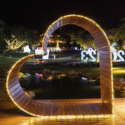 Coração Madeira Iluminado (2,50m de largura, 2,60m de altura e 1,00m de profundidade), produzido em madeira Deck de alta resistência em formato de coração.Contorno com mangueira luminosa led de 12 MM de diâmentro, com efeito estrobo, sendo que a cada a cada 04 (quatro) lâmpadas QUENTE a quinta lâmpada deve ser na cor BRANCO QUENTE (obedecendo a temperatura de cor entre 6000 e 6500K) que pisca, o corte a cada metro, com 36 LEDs por metro, Leds deitado com visão 360º, potência 3w por metro, 220v.