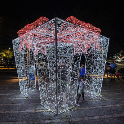 Caixa de Presente (3,25 de largura x 3,25 de profundidade x 3,60 de altura), luminoso em forma de Caixa de Presente com porta de abertura no formato de Oval para passagem de pedestre, produzido em estrutura metálica, em tubos de metalon 20x20 e 15x15 Par 15, ferro chato 1/2 x 1/8, reforço em ferro redondo liso 3/16, além de cantoneira 1x1/8. Todo contorno recebe arame 4,2mm para fixação dos cordões de led, pintura automotiva na cor BRANCA. Contorno com mangueira luminosa led de 10 MM de diâmentro, com efeito fixo, o corte a cada metro, com 36 LEDs por metro, Leds deitado com visão 360º, potência 3w por metro, 220v, totalmente a prova dágua, na cor BRANCO FRIO (obedecendo a temperatura de cor entre 6000 e 6500K). Revestimento interno com cordões de 100 LED blindado 220v, para suo externo, com efeito estrobo, sendo que a cada 04 (quatro) lâmpadas BRANCO FRIO a quinta lâmpada deve ser na cor BRANCO FRIO (obedecendo a temperatura de cor entre 6000 e 6500k) que pisca, e lâmpadas AZUL a quinta lâmpada deve ser na cor BRANCO FRIO, ambas com espaçamento de 0,10m entre as lâmpadas, com comprimento mínimo de 10 metros com 4 fios de 1,8 MM, no mínimo 100 leds por cordão. Lâmpadas de 5 MM ou mais, blindadas com cola de silicone na sua base, com revestimento em plástico duro transparente e recobertas por capa plástica na cor BRANCO e AZUL respectivamente. Tomada macho e fêmea de rosca e retificador blindado 12w de 7.00 x 2,5 centímetro.