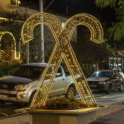 Bengala Dupla (2,50de largura x 0,20 de profundidade x 2,50 de altura), luminoso em forma de Bengalas , produzido em estrutura metálica, em tubos de metalon 20x20 e 15x15 Par 15, ferro chato 1/2 x 1/8, reforço em ferro redondo liso 3/16, além de cantoneira 1x1/8. Todo contorno recebe arame 4,2mm para fixação dos cordões de led, pintura automotiva na cor BRANCA. Contorno com mangueira luminosa led de 10 MM de diâmentro, com efeito fixo, o corte a cada metro, com 36 LEDs por metro, Leds deitado com visão 360º, potência 3w por metro, 220v, totalmente a prova dágua, na cor BRANCO FRIO (obedecendo a temperatura de cor entre 6000 e 6500K). Revestimento interno com cordões de 100 LED blindado 220v, para suo externo, com efeito estrobo, sendo que a cada 04 (quatro) lâmpadas BRANCO FRIO a quinta lâmpada deve ser na cor BRANCO FRIO (obedecendo a temperatura de cor entre 6000 e 6500k) que pisca e lâmpadas VERMELHA a quinta lâmpada deve ser na cor BRANCO FRIO, ambas com espaçamento de 0,10m entre as lâmpadas, com comprimento mínimo de 10 metros com 4 fios de 1,8 MM, no mínimo 100 leds por cordão. Lâmpadas de 5 MM ou mais, blindadas com cola de silicone na sua base, com revestimento em plástico duro transparente e recobertas por capa plástica na cor BRANCO e VERMELHO respectivamente. Tomada macho e fêmea de rosca e retificador blindado 12w de 7.00 x 2,5 centímetro.