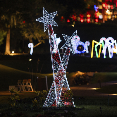 Duo de Estrelas (1,25 de largura x 0,06 de profundidade x 2,50 de altura), luminoso em forma de Estrelas em Hastes , produzido em estrutura metálica, em tubos de metalon 20x20 e 15x15 Par 15, ferro chato 1/2 x 1/8, reforço em ferro redondo liso 3/16, além de cantoneira 1x1/8. Todo contorno recebe arame 4,2mm para fixação dos cordões de led, pintura automotiva na cor BRANCA. Contorno com mangueira luminosa led de 10 MM de diâmentro, com efeito fixo, o corte a cada metro, com 36 LEDs por metro, Leds deitado com visão 360º, potência 3w por metro, 220v, totalmente a prova dágua, na cor BRANCO FRIO (obedecendo a temperatura de cor entre 6000 e 6500K). Revestimento interno com cordões de 100 LED blindado 220v, para suo externo, com efeito estrobo, sendo que a cada 04 (quatro) lâmpadas BRANCO FRIO a quinta lâmpada deve ser na cor BRANCO FRIO (obedecendo a temperatura de cor entre 6000 e 6500k) que pisca e lâmpadas VERMELHA a quinta lâmpada deve ser na cor BRANCO FRIO, ambas com espaçamento de 0,10m entre as lâmpadas, com comprimento mínimo de 10 metros com 4 fios de 1,8 MM, no mínimo 100 leds por cordão. Lâmpadas de 5 MM ou mais, blindadas com cola de silicone na sua base, com revestimento em plástico duro transparente e recobertas por capa plástica na cor BRANCO e VERMELHO respectivamente. Tomada macho e fêmea de rosca e retificador blindado 12w de 7.00 x 2,5 centímetro.